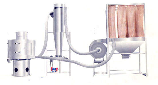 氣流篩分機擯棄重力勢能作業(yè)原理,采用空氣作載體、動能做功的作業(yè)原理,通過負壓氣流將物料與空氣混合后,進入篩機風輪中間,通過風輪葉片施加足夠的離心力,向桶型篩網(wǎng)噴射過網(wǎng),經(jīng)過蝸殼收集,超徑物料不能過網(wǎng),由自動排渣口排出,從而達到快速篩分之目的。微細粉物料經(jīng)進料斗流入進料斗口,立即擴散并與空氣混合成霧狀,經(jīng)風輪的作用,呈旋風狀噴射過網(wǎng),在引風機的作用下,氣體與細粉全部進入沉降室,成品細粉沉降后由下部排出,帶有少量粉塵的氣體進入除塵布袋,經(jīng)凈化后排出袋外。